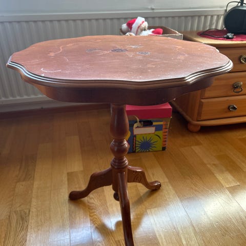Pieni pöytä, jossa on neljä jalkaa ja suorakulmainen pöytälevy. Pöydän pinta on tummanruskea ja siinä on selkeä puunsyykuvio. Koristeelliset jalat, tukeva.
