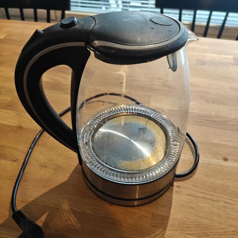 Paljon käytetty, mutta yhä toimiva muovinen vedenkeitin. Nouto Pirkkalasta Pereeltä.