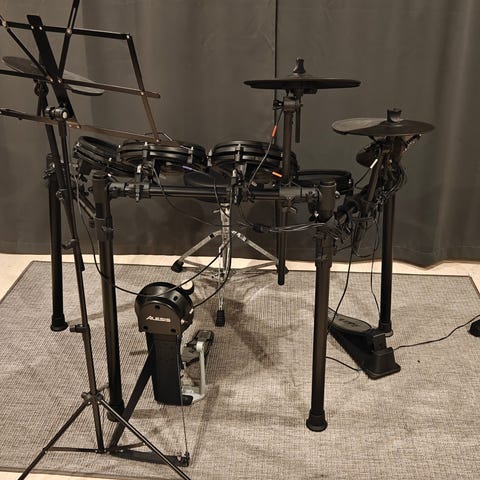 Tornion musiikista 16.1.24 käytettynä ostetut sähkörummut (Alesis Deput Kit). Olleet meillä hyvin vähäisellä käytöllä. Käyttöohje löytyy sähköisessä muodossa. Istuin kuuluu kauppaan. Jo ostovaiheessa on puuttunut rumpujen tukijalasta toinen "tassu" (näkyy kuvassa). Vahvistin/kaiutin ei sisälly kauppaan.