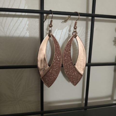 Naisten leveät rosegold-väriset metallikorvakorut. Korvakorut ovat rengasmalliset, joissa on kiiltävä pinta ja keskellä kapeampi, kimalteleva raita. Kiinnitys tapahtuu metallisella lukolla.