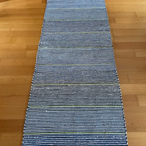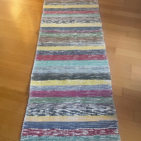 Kaunis ja laadukas kangaspuilla kudottu räsymatto. Mitat hapsujen kanssa noin 75x280cm. Uusi/käyttämätön.