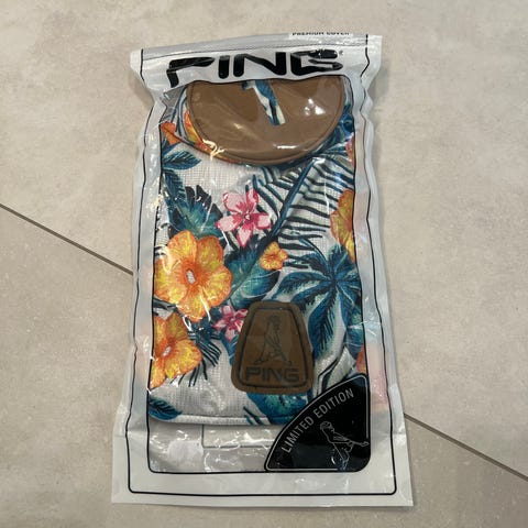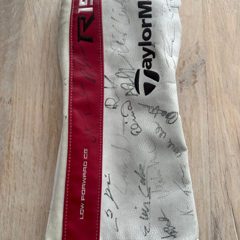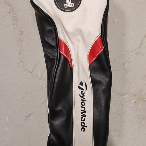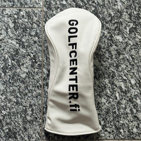 Golf Studios mailanpäällinen driverille. Väri valkoinen oransseilla yksityiskohdilla ja kirjailulla. Suunniteltu golfmailan pään suojaamiseen kulumiselta ja kolhuilta kuljetuksen ja säilytyksen aikana.
