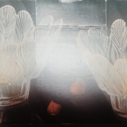 Riihimäen lasin valmistama "Jäkälä"-tuikkualusta viidelle tuikulle alkuperäisessä pakkauksessaan.