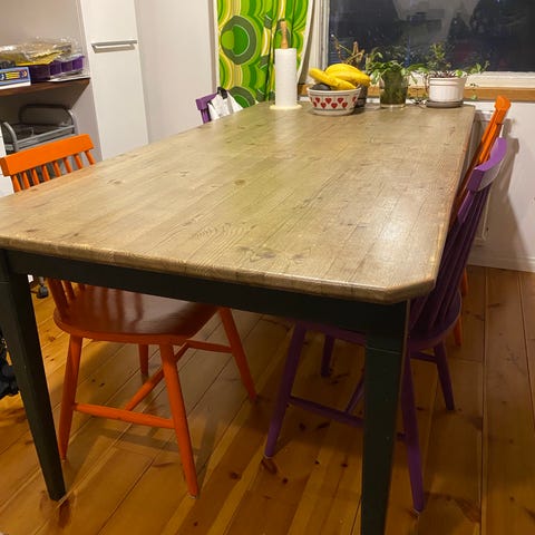 Pöytälevyssä muutamia pieniä naarmuja sekä kolme "palomerkkiä" kuumista astioista, jotka näkyvät ainakin yhdessä kuvassa. Muuten yleisilmeeltään siistissä kunnossa.