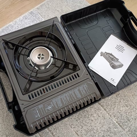 Tämä on siis suunniteltu niin, että kaikki osat mahtuu kattilan sisään, joten pakattuna tää ei vie tilaan kuin sen kattilan verran. Painoakaan ei oo kuin vajaan kahvipaketin verran, jos patruunaa ei lasketa mukaan. Kokoaminen on äärettömän näppärää ja ruoan laittoon pääsee nopeasti.