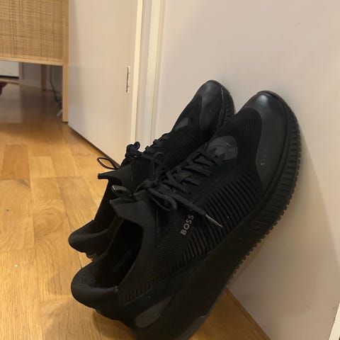 Hugo Boss tennarit, koko 47. Väri musta. Nauhakiinnitys ja matala varsi. Pohja on kumia ja päällinen tekstiiliä ja synteettistä materiaalia. Soveltuvat arki- ja vapaa-ajan käyttöön.