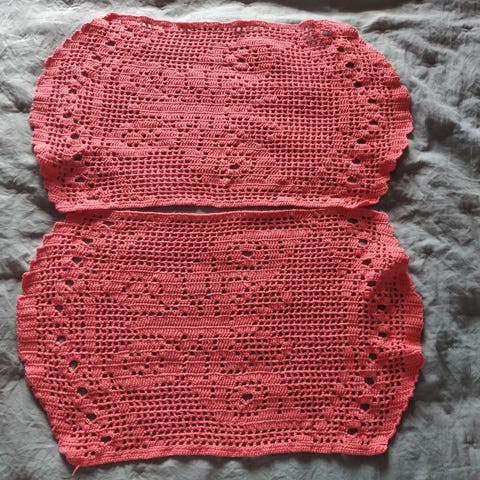 Aitoa käsityötä, 6 puuvillalangasta virkattua oranssia pöytäliinaa/tablettia