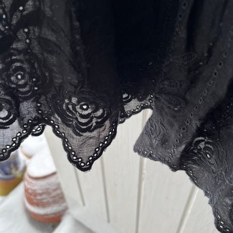 Materiaali kevyttä ekopuuvillaa, brodyyripitsi helmassa.