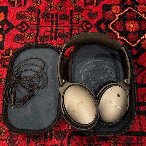 Bose vastamelukuulokkeet. Mukana kovakantinen säilytys- ja kuljetuskotelo. Käytetty ainostaan lentomatkoilla, eli todella vähän. Akku pelittää edelleen hyvin, vaikka näillä on ikää useampi vuosi.