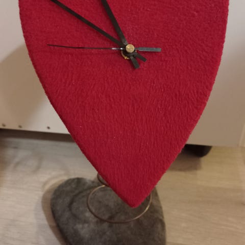 Sydämenmallinen kello, neulassa kaiverrus. Toimivuudesta en tiedä, ainakin paristo pitää vaihtaa.