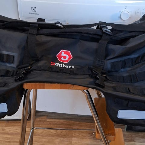 Takalaukku. Tulee takapenkin päälle ja muotoiltu niin. Tavaraa sopii hyvin kyytiin. Mukaan sadesuoja. Helppo asentaa.