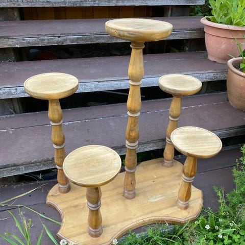 Valkoinen kukkapöytä pyörillä, käyttämätön, tasot metallia, Jalat puuta. Korkeus 65 cm, ylin taso 55 cm, leveys 35, syvyys 50.