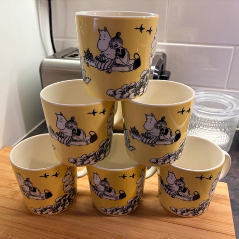 Arabia Muumi muki keltainen. Keraaminen juomamuki, jossa Muumi-hahmojen kuvitus ja keltainen pohjaväri. Soveltuu esimerkiksi kahvi- tai teemukiksi arkeen ja kattauksiin.