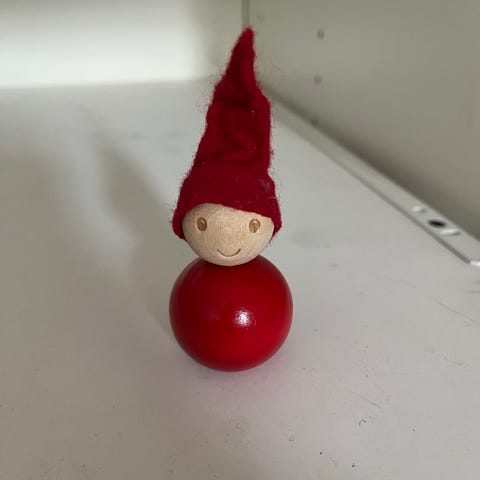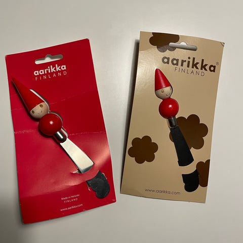 Aarikka joulukoriste veitsi, jossa kahvassa puinen tonttuhahmo punaisella lakilla ja punaisella helmellä. Teräosa metallia. Sopii esimerkiksi juusto- tai voiveitseksi joulupöytään ja muuhun kausikattaukseen.