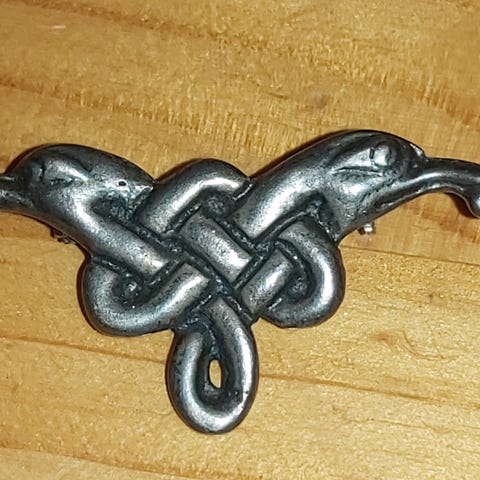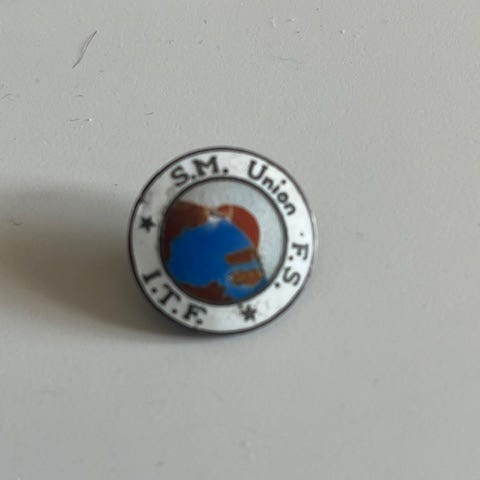 Sotilaskotiliiton vanha jäsenmerkki. Messinkiä, ehjät emaloinnit, ehjä ja toimiva neulamekanismi, patinaa. Halkaisija n. 29 mm.