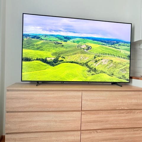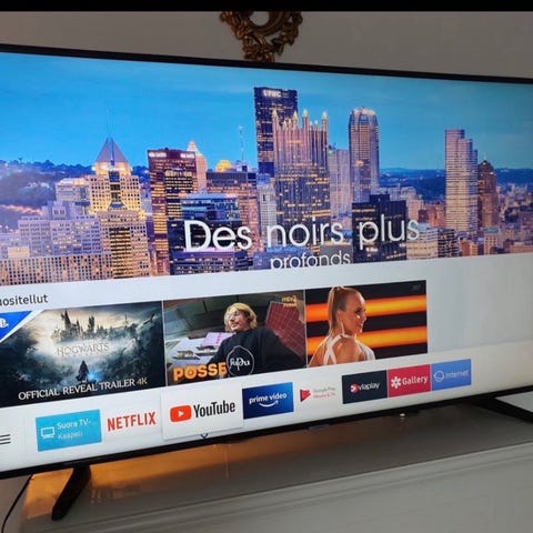 Samsung Crystal UHD UE65TU7025 älytelevisio 65". Televisiossa on suuri 65 tuuman näyttö ja Crystal UHD -paneeli, joka tukee 4K-tarkkuutta. Kyseessä on Smart TV -malli, josta löytyvät yleiset suoratoistosovellukset ja verkkoyhteydet. Mukana on kaukosäädin, ja televisio on yhteensopiva seinätelineen kanssa, kuten kuvissa näkyvä kiinnitysratkaisu osoittaa. Väriltään televisio on musta ja se soveltuu olohuoneen päätelevisioksi tai muuhun tilaan, jossa tarvitaan isokokoista 4K-televisiota.
