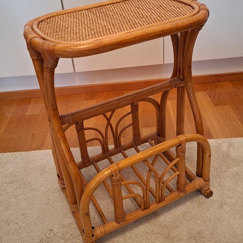 Myydään rottinkinen lehtiteline. Siistissä kunnossa.