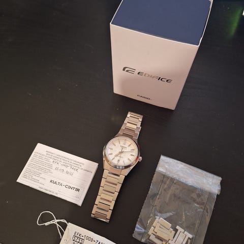 Myydään Casio edifice ef-506. Kunto hyvä, koko 40mm, vesitiivis 100m, nahkaranneke, paristo vaihdettu juuri, ohjekirja mukaan. Tarjoa.