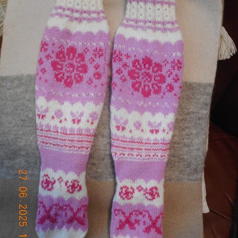 Sukkalangasta (75/25) kudottu. Varren pituus 44cm. Kuvio violetti. Postitus kirjeenä 5,50 tai toridiili.