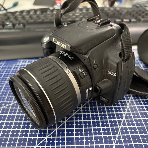 Ollut itselläni pitkään, mutta pitkään jo myös kaapissa säilytyksessä. Kamera ei ole ollut mitenkään tehokäytössä, joten käyttöikää sulkimen osalta varmasti vielä piisaa. Kumiosat hieman repsottaa, olisivat varmasti helposti liimattavissa takaisin kiinni. Muuten hyvässä kunnossa.