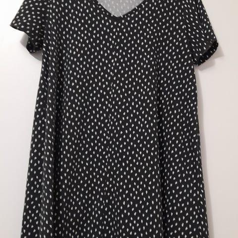 Leveähelmainen mustavalkea tunika 3/4-hihoilla. Kokolapussa XS mutta aika reilua kokoa, menee myös S-kokoiselle. Niskassa metallivetoketju. 95% viskoosia, 5% elastaania.