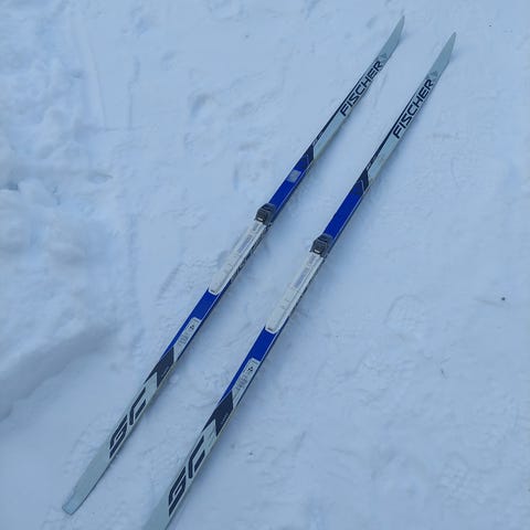 Fischer maastohiihtosukset ja monot Salomon-siteillä. Suksissa on Salomon Profil -siteet, jotka sopivat yhteensopiviin maastohiihtomonoihin. Monot ovat nauhakiristeiset ja vetoketjullisella päällisellä, väriltään vaaleat mustilla ja keltaisilla yksityiskohdilla. Setti soveltuu perinteiseen maastohiihtoon.
