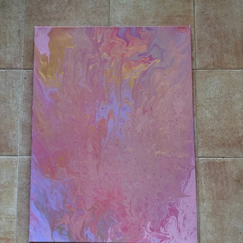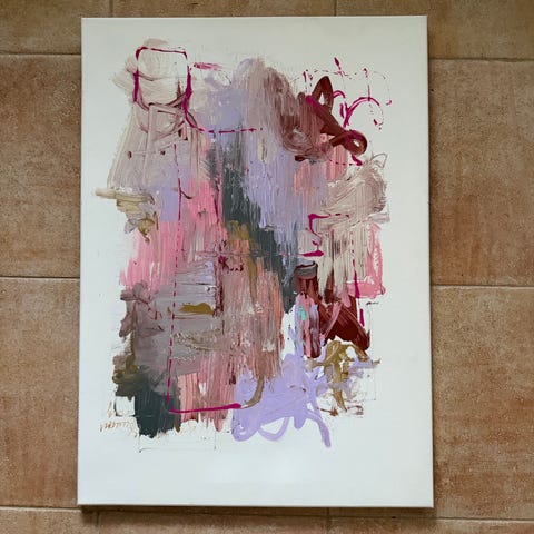 Abstrakti maalaus, jossa on kerroksellisia, aaltoilevia muotoja vihreän, valkoisen ja viininpunaisen sävyissä. Teos on toteutettu tekstuurilla ja akryyleilla.