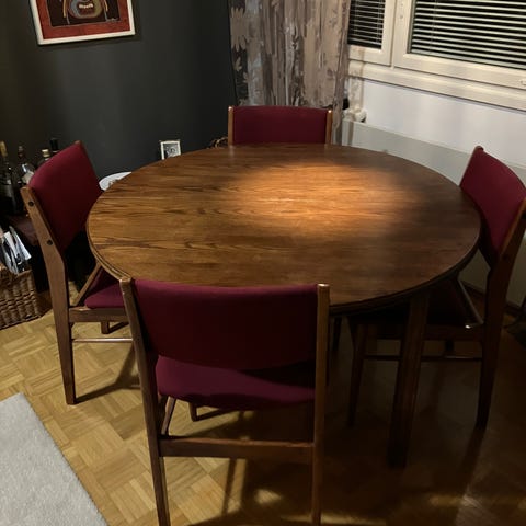 Jykevää tekoa oleva jatkettava ruokapöytä. Pöydän saa jatkettua keskeltä. Kovassa käytössä ollut ja kolhuja siellä täällä. Tällä hetkellä pöytä on purettuna osiin (pöytälevy ja jalat). Tuolit eivät kuulu kauppaan.