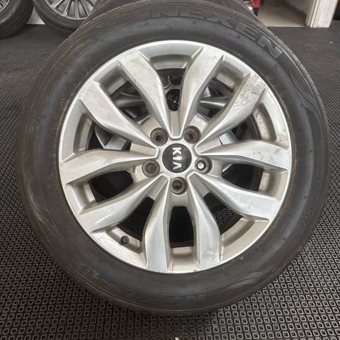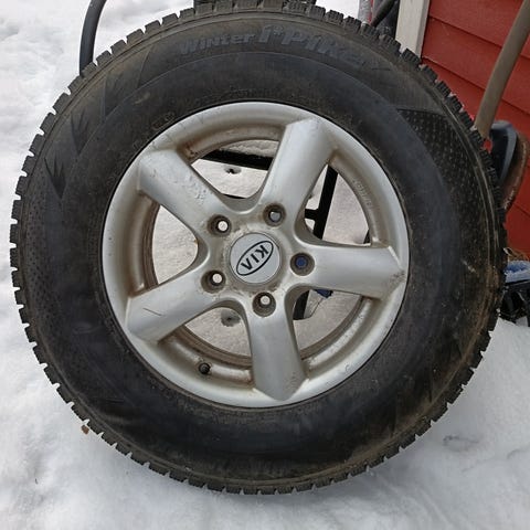 Tästä kierros nastarenkaita lopputalveksi. Ovat olleet Kia Riossa. Nastoja ei ole irronnut ja kulutuspintaa runsaasti. Vanteissa pientä ruostetta.
