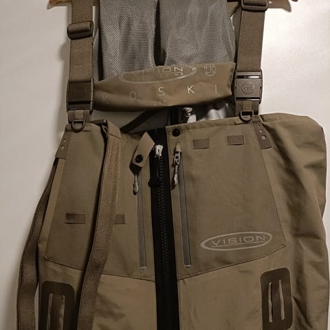 Vision Scout kahluuhousut beigeä väriä. Housuissa on korkea yläosa, säädettävät olkaimet ja vyötäröremmi. Edessä on vetoketjullinen rintatasku. Mukana tulee Vision Scout -kuljetuspussi säilytystä ja kuljetusta varten. Ei vuoda mistään, eikä ole paikattu. Huolellinen vesipesu tehty kauden päätteeksi.
