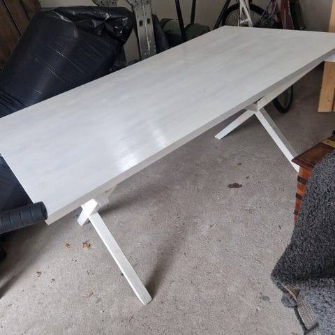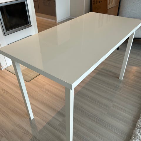 Pöytä hyvässä kunnossa, kannessa jälki (kts kuva), toki muitakin käytön jälkiä, kun uusi ei ole. Mutta yleiskunto hyvä.