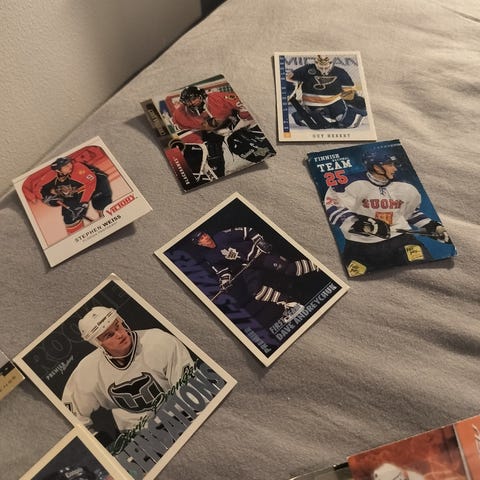 Jääkiekko keräilykorttien kokoelma. Korteissa on useita eri pelaajia ja joukkueita, mukana muun muassa maalivahtiaiheisia erikoiskortteja. Kortit on säilytetty metallirasiassa, joka sisältyy kokonaisuuteen. Sopii keräilyyn, lajitteluun ja vaihdettavaksi muiden keräilijöiden kanssa. Korteista voi pyytää lisätietoja