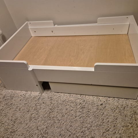 Tarjolla kaksi sänkyä ja varasänky. Varasängyssä pyörät ja mekanismi, joka nostaa varasängyn samalle tasolle muiden sänkyjen kanssa. Tosi näppärä yökyläilijöille. Sängyissä jonkin verran käytönjälkeä, ja pieni halkeama laidassa liian tiukalle väännetyn ruuvin seurauksena.