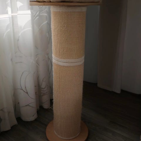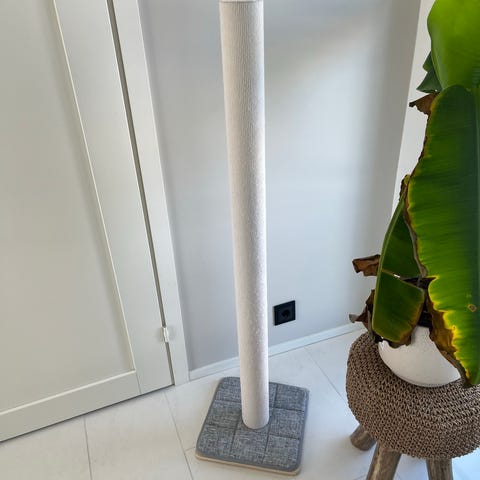 Raapimispuu kissalle. Vapaasti seisova malli, jossa on neliönmuotoinen jalusta ja korkea pylväs. Siitä jollekin ensihätään, ajaa asiansa vaikkei nätein olekaan.