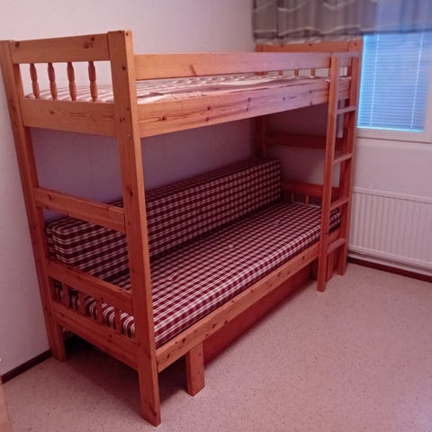 Kerrossänky lapsille. Metallirunkoinen, harmaa kerrossänky, jossa ylä- ja alavuode. Ylävuoteessa suojakaiteet ja kiinteä vino tikas helpottamassa kulkua. Soveltuu lasten tai nuorten nukkumiseen ja tilansäästöön samassa huoneessa.