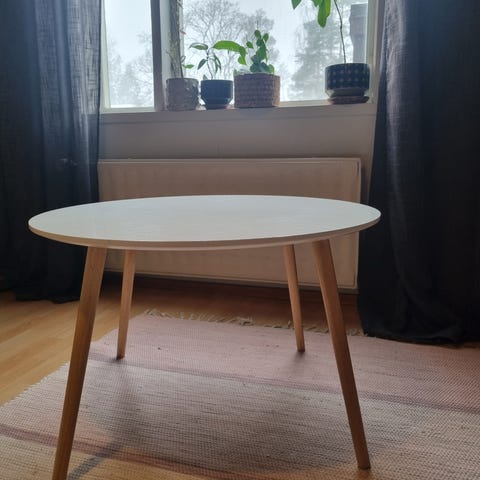OSTAN pyöreän, puisen sohvapöydän alatasolla. Pöytä saisi olla vähintään 80 cm halkaisijaltaan (mieluummin suurempi). Tarjoa!