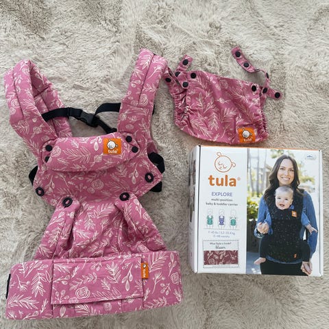 Tula kantoreppu raidallisella turkoosi-valkoisella kuosilla. Kantorepussa on säädettävät olka- ja vyötäröhihnat sekä solkikiinnitykset. Mukana irrotettava unihuppu, joka kiinnittyy neppareilla olkahihnoihin. Sopii vauvan tai taaperon kantamiseen edessä tai selässä.