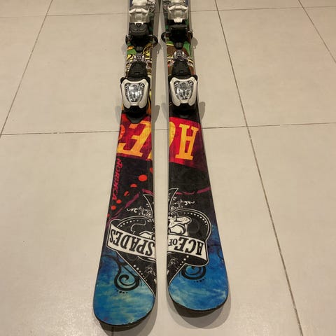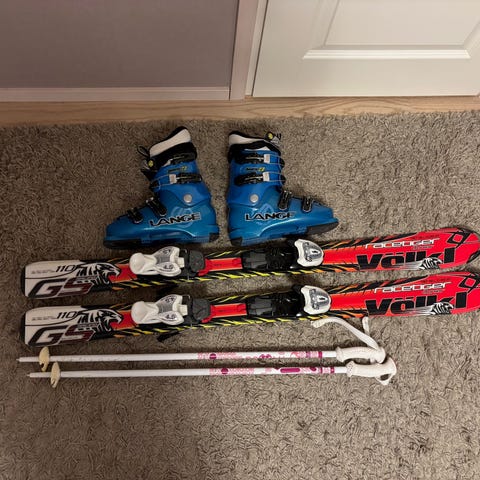 Lasten laskettelusetti, johon kuuluu firefly rocket twintip sukset 115cm, firefly f50 laskettelumonot kokoa 33 sekä sauvat.
