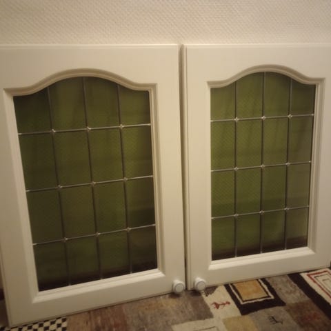 Yläkaapien vitriini lasiovet, joissa huurrettu lasi ja alumiininen kehys. Varustettu metallisilla vetimillä. Sopii käytettäväksi keittiön kaapistossa tai varaosiksi vastaavanlaiseen. Kunto hyvä. 796 x 316 4 kpl, 596 x 316 1 kpl. Ruuvit mukana. Hinta 12Eur per kpl, myydään kaikki yhdessä.