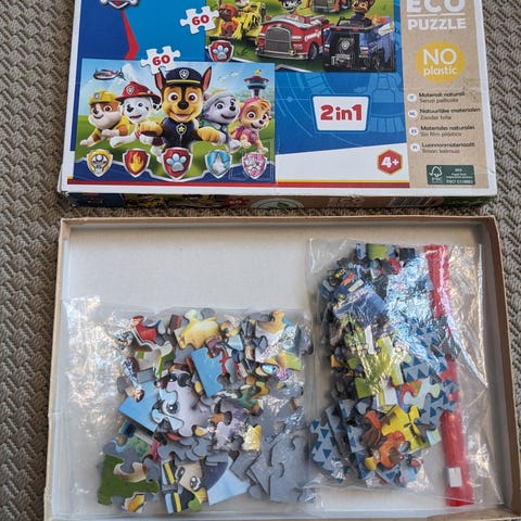 Lasten Ryhmä Hau -aiheinen palapeli, 2 erilaista eli 60+60 palaa. Ikäsuositus 4+. Hyväkuntoinen.