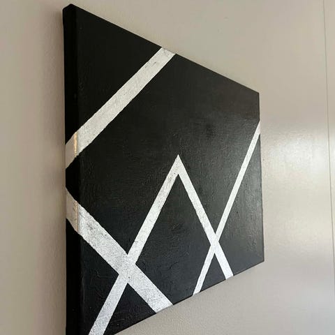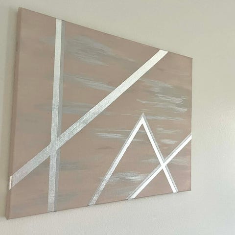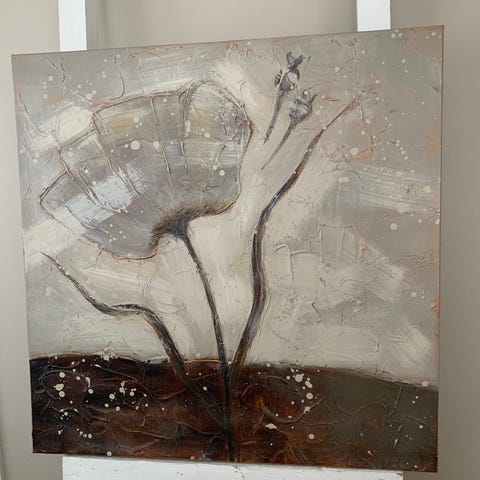 Abstrakti neliosainen taulu, jossa vaalea pohja ja kaarevia viivamaisia kuvioita sekä tummempi, teksturoitu alaosa. Värit ovat pääosin valkoinen, musta ja harmaa, joukossa joitakin ohuita punaisia viivoja ja hopeaa. Teos koostuu neljästä erillisestä paneelista, jotka muodostavat yhdessä yhtenäisen kuvan. Materiaali vaikuttaa maalaus kankaalle, puukehikot takana. Teetetty, ei siis kahta samanlaista
