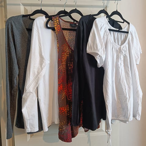 Viisi erilaista xl kokoista paitaa settinä. Yhdessä kokomerkintä 44. Eri merkkejä. Siistit. Koirakoti.