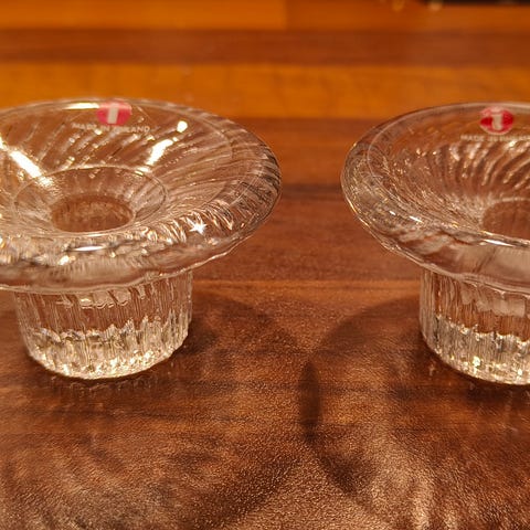 Iittala maaru lasiset kynttilänjalat on suunnitellut Valto Kokko. Halkaisija 6,8 cm ja korkeus 3,5 cm.