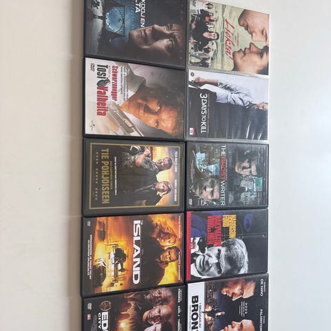 Sekalainen laatikko elokuvia ei ole katsottu, mutta silmämääräisesti käyty levyt läpi että toimivassa kunnossa 1-2 huonompi kuntoista, voi olla eri aluekoodeilla ja ilman tekstityksiä muutama.