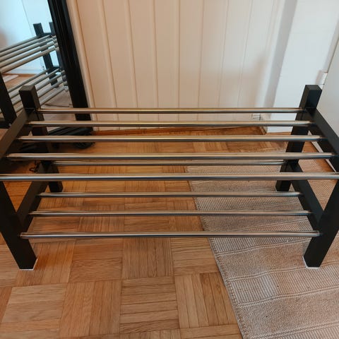 Harmaa kaksikerroksinen kenkähylly. Ulosvedettynä pituus on 100cm, mutta hyllyssä sisällä 58*68cm. https://www.ikea.com/fi/fi/p/komplement-ulosvedettaevae-kenkaehylly-tummanharmaa-10257467/#content