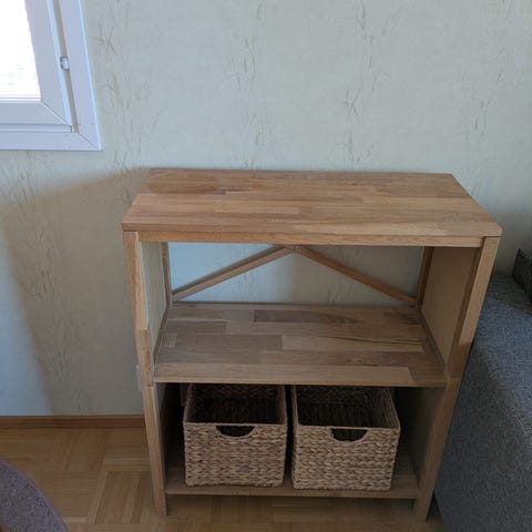 Puinen hyllykkö kahdella laatikolla.