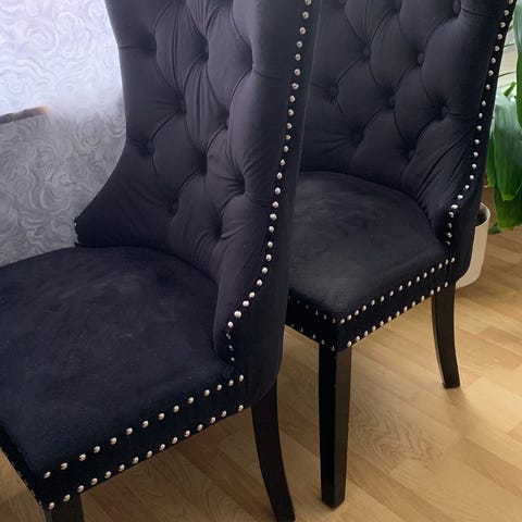 Kaksi kangasverhoiltua tuolia. Hieman tahroja. Istuinosan korkeus n. 47cm