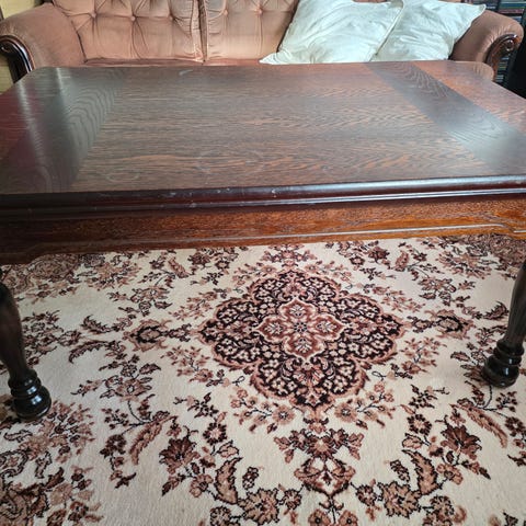 Pinnassa pieniä naarmuja, niistä kuvat. Matalasta pöydästä puuttuu yksi ruuvi, ei vaikuta käyttöön.