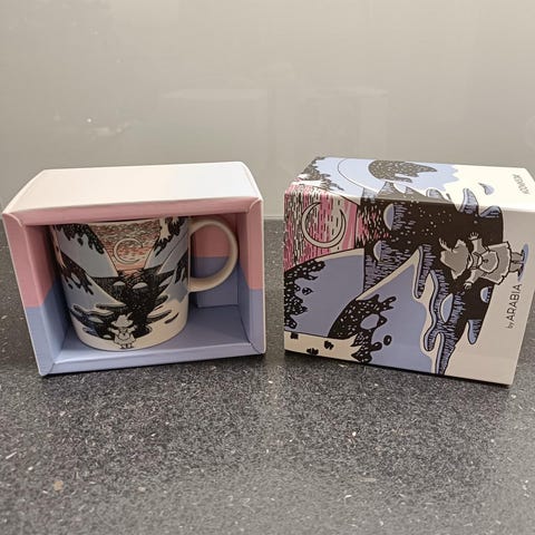 Muuminpäivä 2021 -muumimuki tarralla & pahvilaatikolla.
