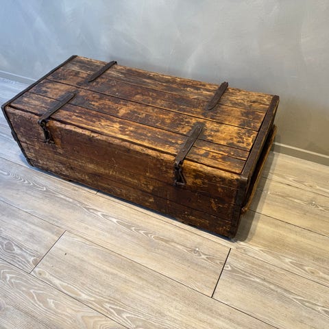 Massiivipuuta, tummaksi käsitelty. Mustat rautavahvikkeet ja kahvat. Toimii säilytysarkkuna, sohvapöytänä tai sisustuselementtinä.
